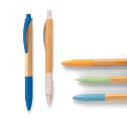 Esferográfica em bambu com clipe antideslizante e elementos coloridos em fibra de trigo e ABS. Escrita a azul. Por ser um produto composto por materiais (...)