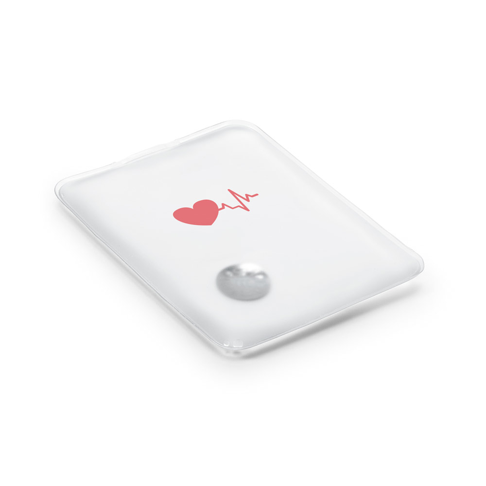 Bolsa de calor em PVC que gera calor instantaneamente ao pressionar a placa de metal do seu interior. Produto promocional. 88 x 110 mm