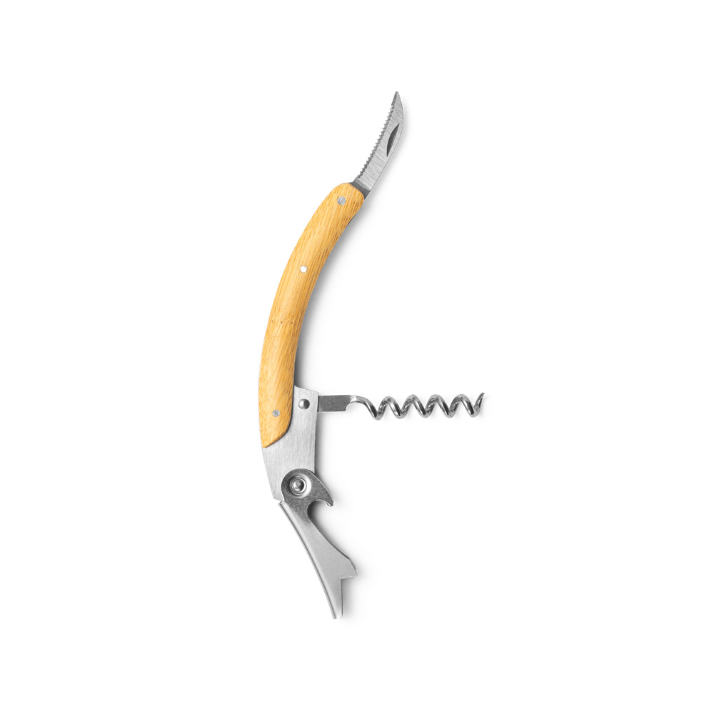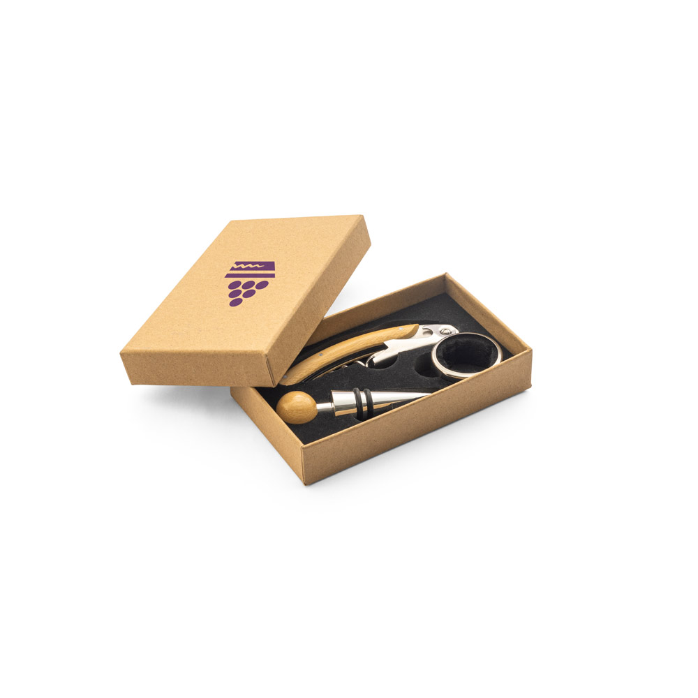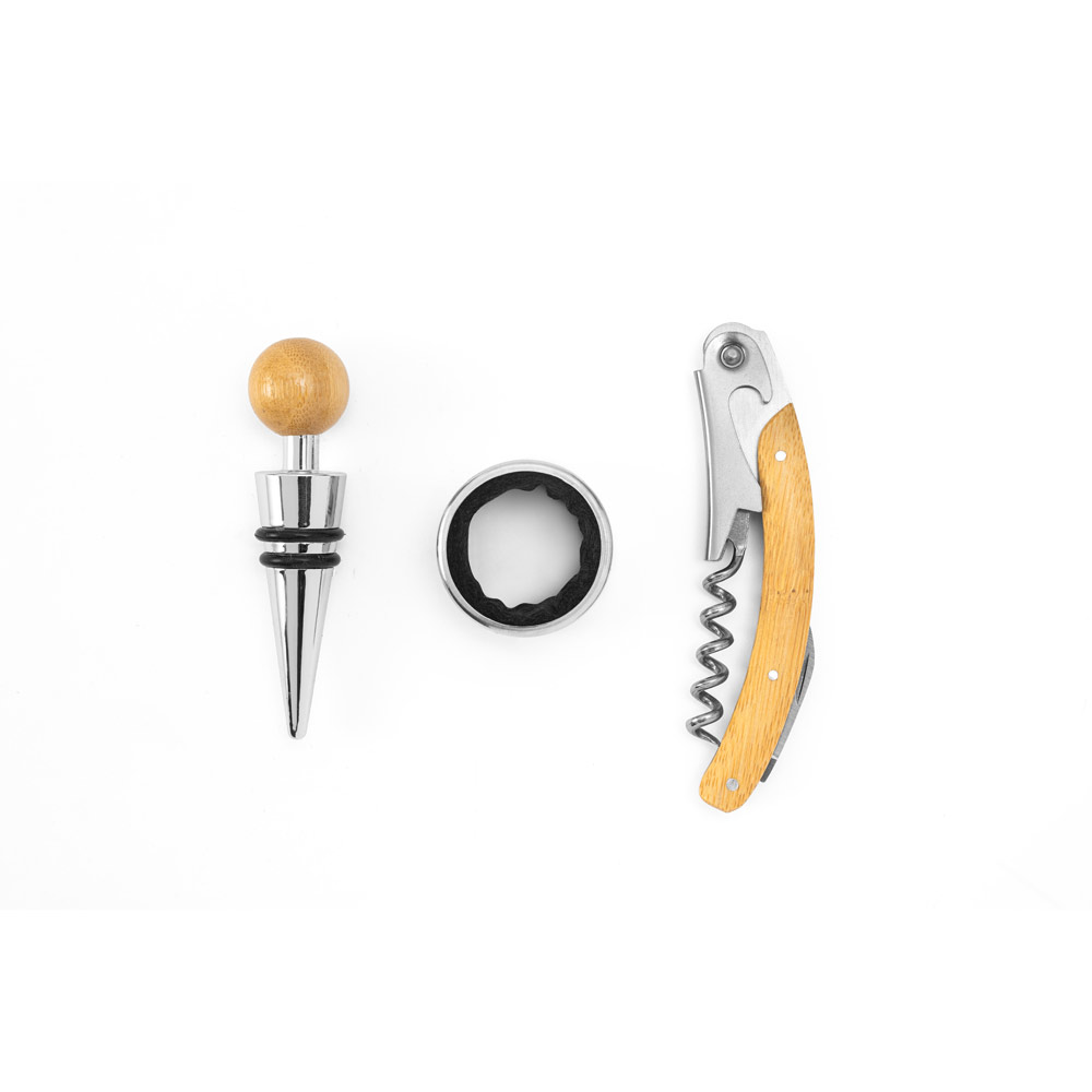 Conjunto para vinho em bambu e aço inoxidável. Inclui dentro da caixa: 1 saca-rolhas, 1 rolha e 1 anel de metal. Fornecido em caixa de oferta em papel kraft. Por ser um produto composto por materiais naturais, a cor do produto e o resultado da impressão podem variar entre produtos. 160 x 100 x 27 mm