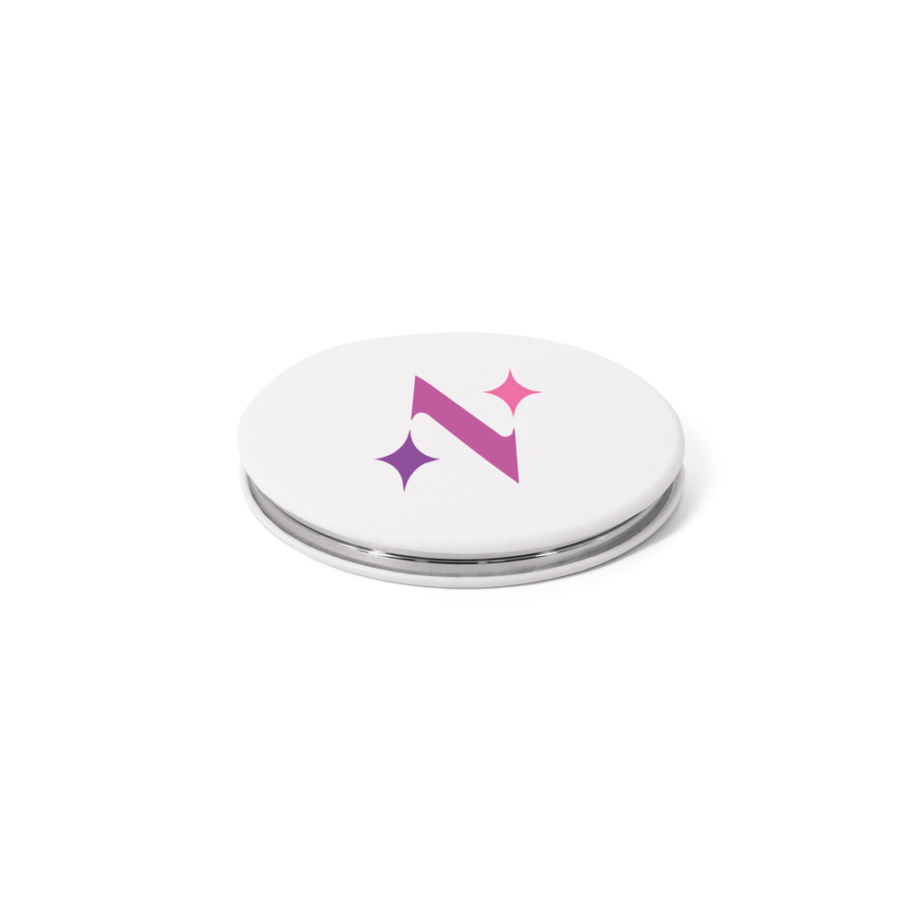 Espelho redondo de dupla face com exterior em PU mate e moldura metálica no interior. Um dos lados do espelho é normal, o outro é de aumento. Fornecido em caixa de oferta. ø70 mm | Caixa: 80 x 80 x 15 mm